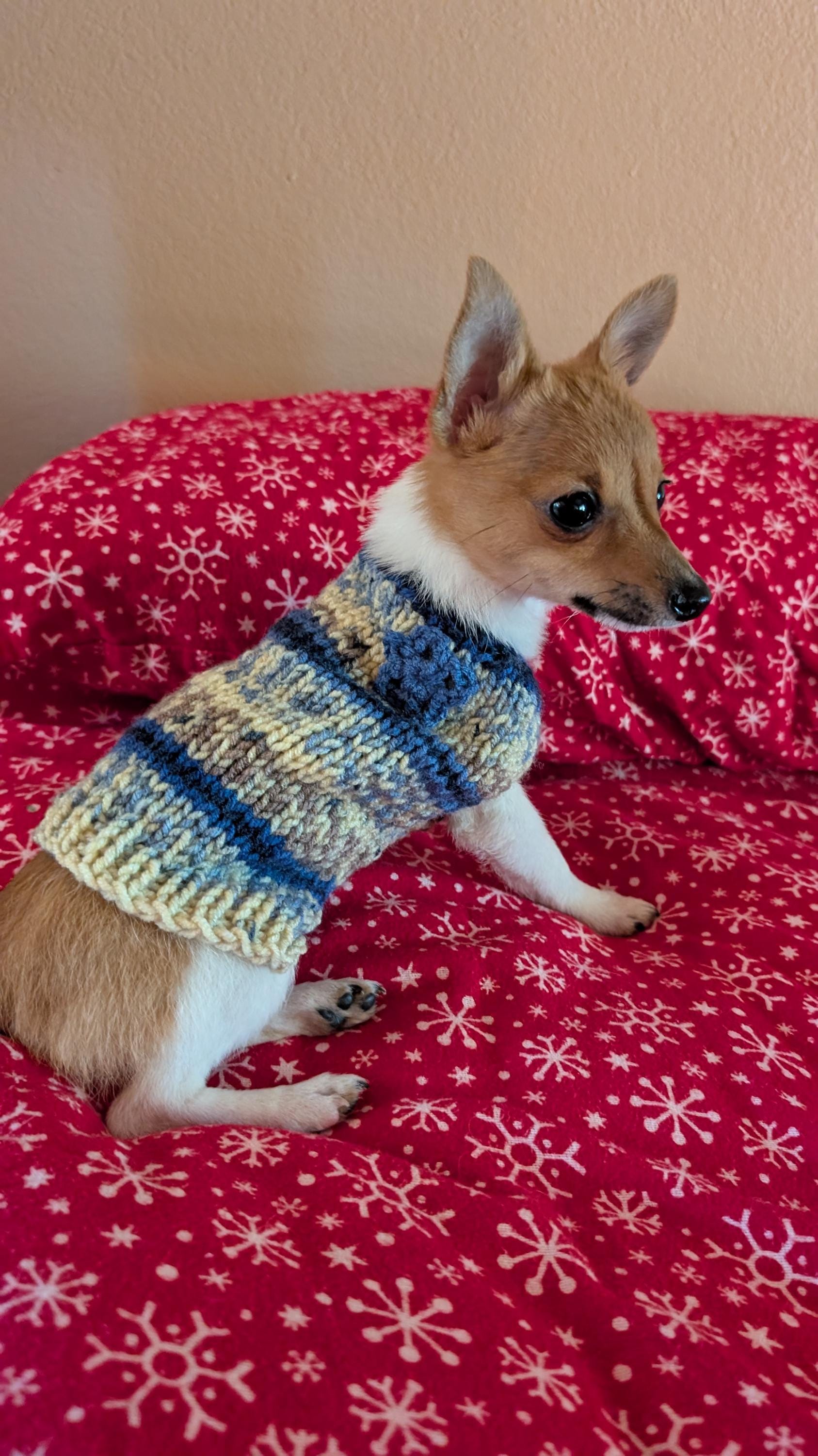 These are little sweaters just for teeny tiny puppies. After all, these are the puppies that really need the warmth! These are multi-color yarns that I just love! Please note that due to the nature of the yarn every sweater is a "one of a kind" and will look different. The pictures show examples, but do not show the actual sweater you will receive.