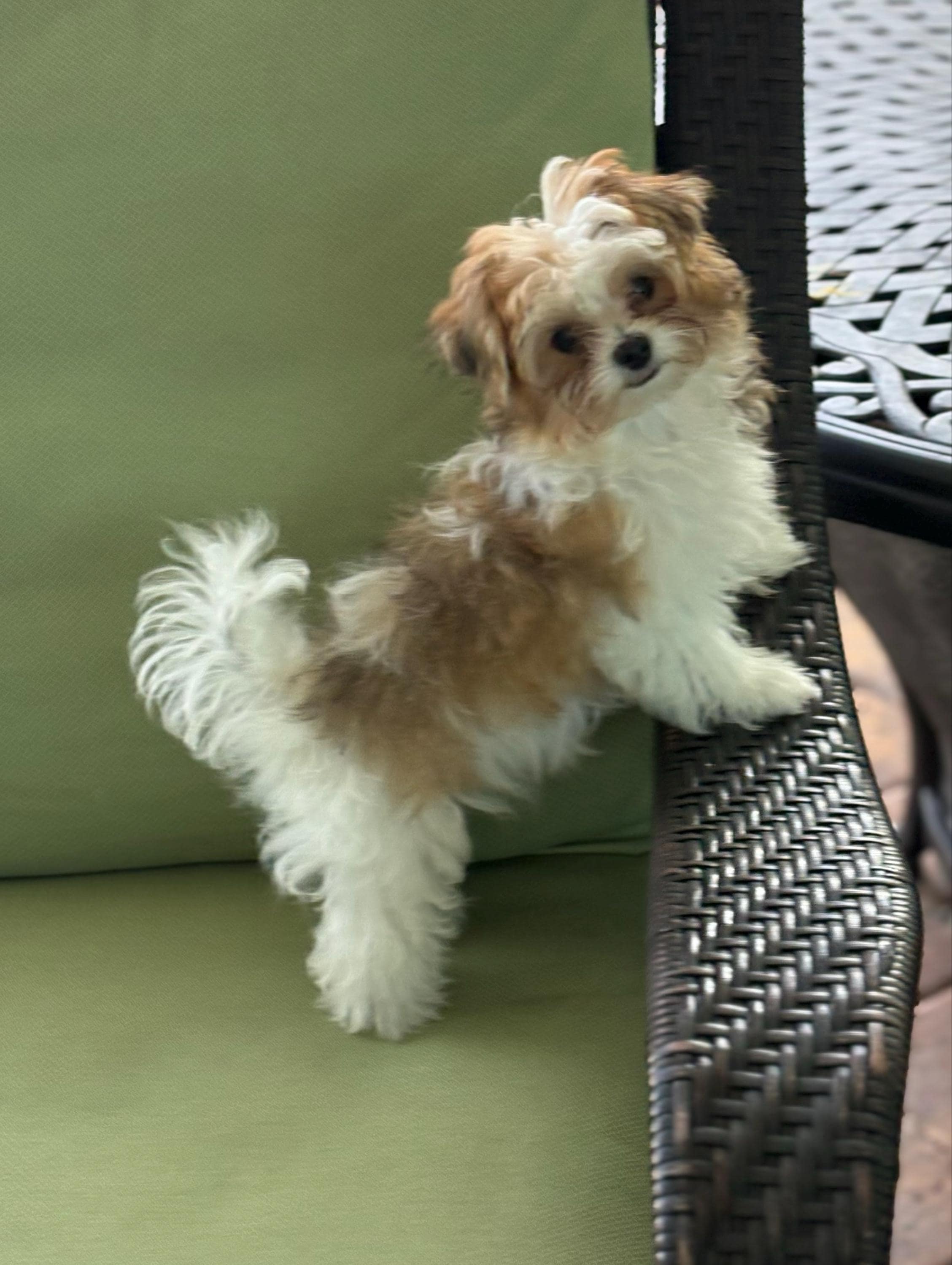 This harness is tiny and the sizes range from 7 to 10 inches measured around the body at the armpits (behind the front legs before the chest starts). It is important that you measure your puppy, this harness is NOT adjustable. You may want to add 1/2 to a full inch if you have a growing puppy. If you don't have your puppy yet and/or you are unsure what size to get, please message me.