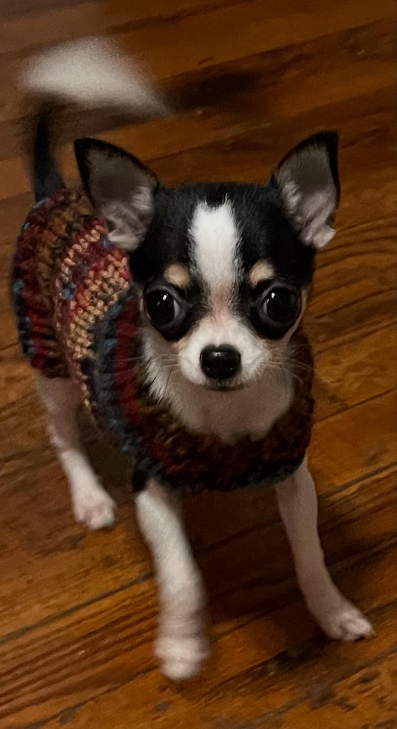 I knitted these tiny little rustic teacup puppy sweaters for puppies of 1 1/2 to under 2 pounds. Due to the nature of this yarn, these sweaters turned out a little different than my usual ones in these same colors.